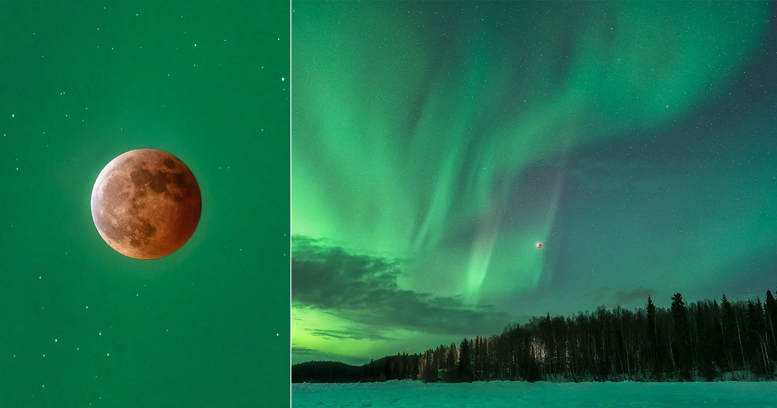 说明:“我从没想过极光和日食之间的相互作用会如此令人着迷,”扎弗拉说。“站在冰冻的湖面上,我看着地貌慢慢变暗,而月亮则滑入地球的阴影中。与此同时,极光变得更加强烈,天空中充满了充满活力的光波。”