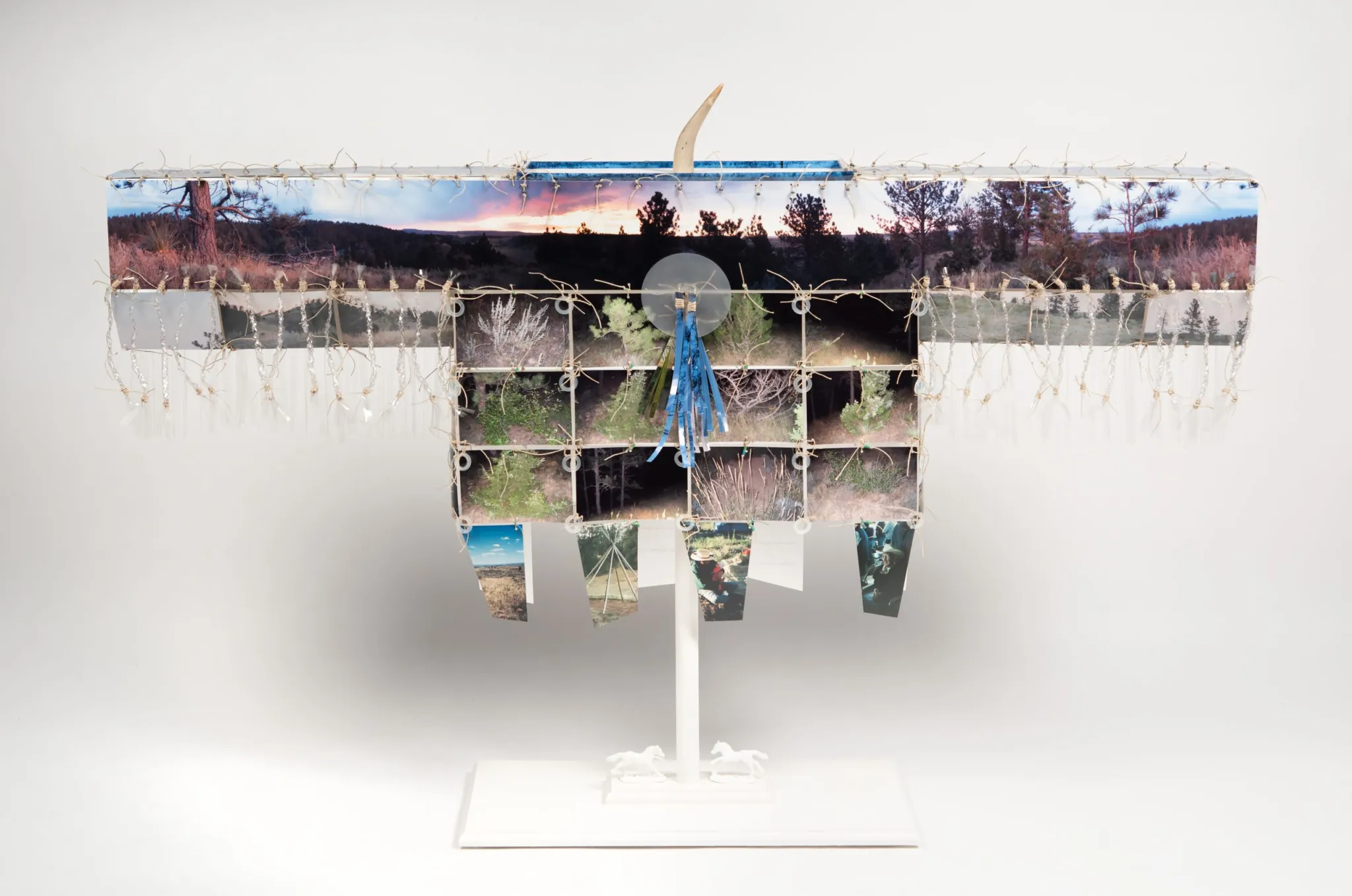 Other works interweave Indigenous motifs to contest archival erasure. Sarah Sense’s (Chitimacha and Choctaw) “Dickens” (2022) weaves archival photographs into a sepia-and-taupe tapestry, its pixelated lattice dulling both the visual impact and the potential dynamism of its medium. The phrase “The New World” emerges faintly from the composition, its faded presence mirroring the erasures embedded in colonial narratives. Wendy Red Star’s (Crow) “Dust” (2020) foregrounds a repititive black-and-white photographed triumvirate against a green, ecru, and white star quilt enrobed in connect-the-dot constellations marked on all sides by the word “dust.” This produces a striking contrast within the composition and in comparison to other metaphysical works, from Jason Clark’s (Non-enrolled Algonquin, Creek) polemic creation scene-like painting “Winona and the Big Oil Windigo” (2014) to Marwin Begaye’s (Diné) depiction of a spectral vulture, “Columbia River Custodian” (2018), which mirror mass produced Native art like posters with glowing wolves, eagles, and buffalos superimposed over sunsets and cosmic backdrops. Red Star instead layers historical and contemporary narratives, evoking a visual parallel to the Three Kings and the Star of Bethlehem from the Bible. She employs repetitive attire and sheriff’s badges, blending Crow and cosmic imagery into a philippic against authority that reflects the compounded impact of colonization and religious imposition.