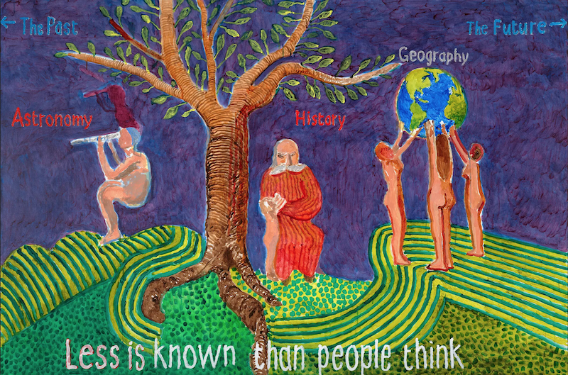 霍克尼在助手的帮助下创作了三件新作品,为展览画上了句号。这三件作品分别是2024年艺术家在伦敦花园的自画像,作品《布莱克之后》(2024年)和《蒙克之后》(2023年),后两者描绘的是模棱两可的场景,灵感来自他曾经在《纽约时报》上看到的一部分标题: “人们知道的比想象的要少。”在这两幅画中,天文、历史和地理与精神性交织在一起。