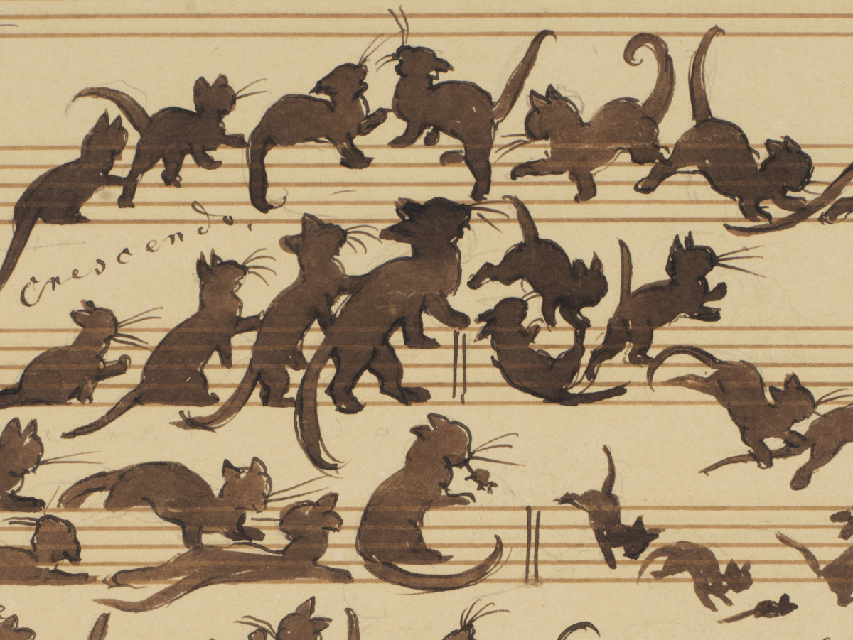 说明:Cats are not the most innately musical creatures. They cannot sing like the thrush or drone with the whales. But their mews and paws have been long incorporated into other kinds of improvisations. Consider the sadistic sixteenth-century cat piano or stories about Alessandro Scarlatti’s black cat, Pulcinella, who inspired her master’s Cat Fugue in G minor during a bout of zoomies across his piano: “‘Bless the cat!’, he cried. ‘She has given me the very theme I have been groping after.’” Cats playing acoustic instruments has been a persistent theme of visual art and cinema. From the 1700 Lombard School orchestra through Fred Astaire’s performance in Let’s Dance (1950) — where he personifies a cat scampering on the ivories (only to reveal that the piano is actually full of terrified kittens) — to contemporary viral videos of feline glissandi, musical cats are perhaps better suited for the eyes than the ears. In Moritz von Schwind’s Katzensymphonie (1868), they climb, tumble, and nap across the lines of stave and clef, producing a sonata for violins in 3/4 and 12/8 time. There’s a German joke here, for Katzenmusik is a term used to describe unpleasant noise, and Richard Wagner’s Kunstwerk der Zukunft (“Artwork of the Future”) seems to have been the target of Schwind’s score.